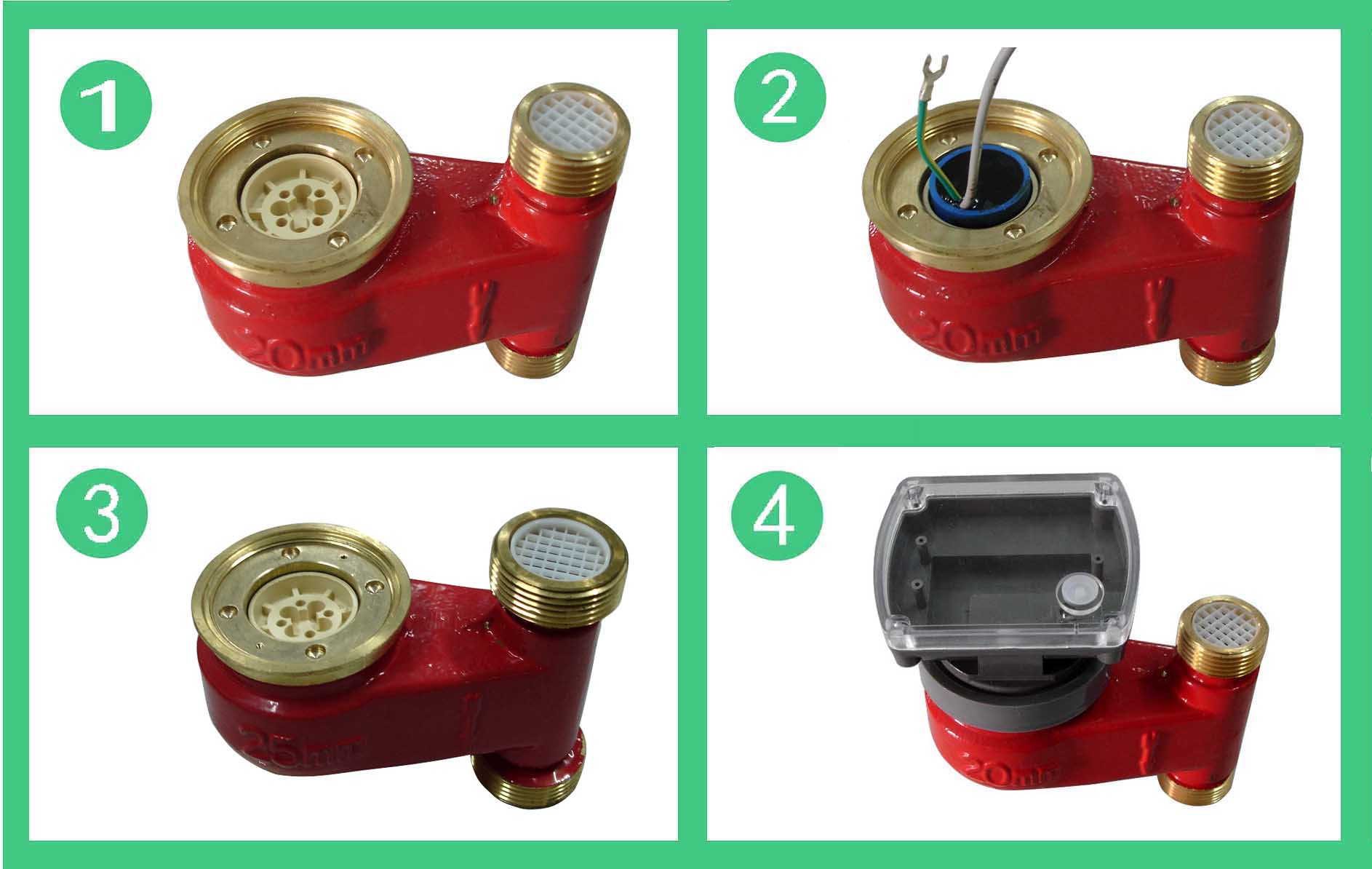 DS97TAR多流束無磁熱量表流量計(jì)的結(jié)構(gòu)如圖,其工作原理是:熱水進(jìn)入流量計(jì),經(jīng)進(jìn)水導(dǎo)向孔沖擊計(jì)量腔內(nèi)的葉輪旋轉(zhuǎn),再經(jīng)出水導(dǎo)向孔流出流量計(jì)。葉輪上面嵌有不銹鋼膜片,隨葉輪旋轉(zhuǎn),在隔板上端接近不銹鋼膜片處可裝電感類傳感器,接受葉輪旋轉(zhuǎn)的周期信號。